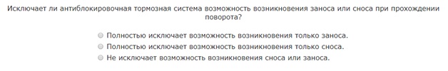 ABS (антиблокировочная система) - предотвращает блокировку колес авто, снижает вероятность заносов и сносов авто, но не исключает их возникновения. Таким образом, правильным будет ответ – 3.