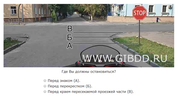 Остановку следует произвести у места В – край пересекаемой проезжей части, а если присутствует стоп линия (разметка 1.12), то остановитесь перед ней.