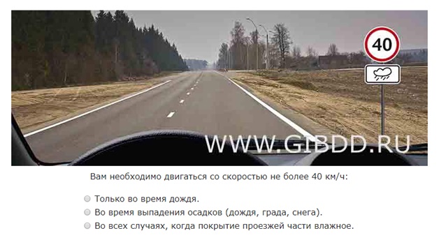 Табличка 8.16 «Влажное покрытие» ставит водителя в известность о том, что скорость на данном не должна превышать 40 км/ч (знак 3.24 «Ограничение максимальной скорости») в период, когда покрытие дороги влажное (к примеру, после или во время дождя, снега и т.д.). Правильным является ответ – 3.