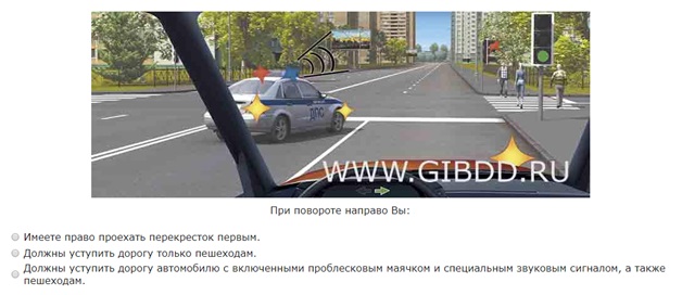 На основании п. 3.1 ПДД, у автомобилей с включенными проблесковыми маячками синего цвета и специальными звуковыми сигналами преимущество перед другим транспортом. Следовательно, вы обязаны пропустить авто с мигалкой, а затем осуществить поворот направо, пропустив еще и пешеходов на основании п. 32 и 13.1 ПДД.