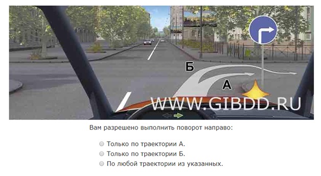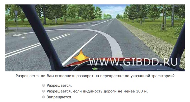 На основании п. 8.5 ПДД, разворот на перекрестке разрешен только из крайнего левого положения, то есть, указанная на картинке траектория разворота запрещена. Верный ответ – 3.