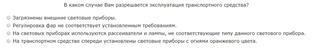 На основании Перечня неисправностей, при которых запрещается эксплуатация транспорта, п.п. 3.3, 3.2, 3.4, 3.6, вы можете эксплуатировать транспортное средство с установленными спереди световыми приборами с огнями оранжевого цвета. Остальные из перечисленных условий запрещают эксплуатацию ТС.