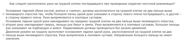 Давить нужно двумя руками, выпрямив их в локтях. Одна ладонь кладется на середину грудной клетки на два пальца выше мечевидного отростка, а вторая – на нее. Руки складываются замком так, чтобы большие пальцы рук указывали на живот и подбородок.
