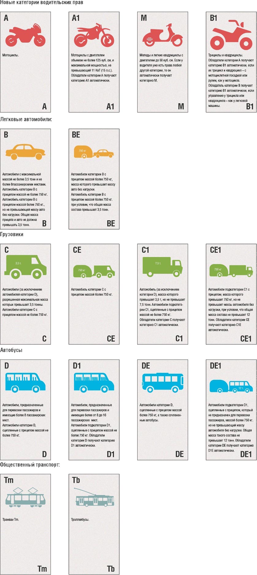 Ранее существовавшие категории A, B, C, D и E «углублены» более детальными видами: A1 — мотоциклы с объемом двигателя до 125 куб. см, B1 — квадроциклы и трициклы, C1 — автомобили с разрешенной массой от 3,5 до 7,5 тонны и D1 — автомобили, предназначенные для перевозки пассажиров с количеством от 8 до 16 мест.