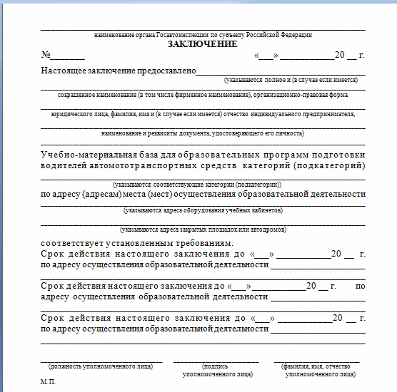 Форма заключения ГИБДД о соответствии учебно-материальной базы автошколы установленным требованиям: