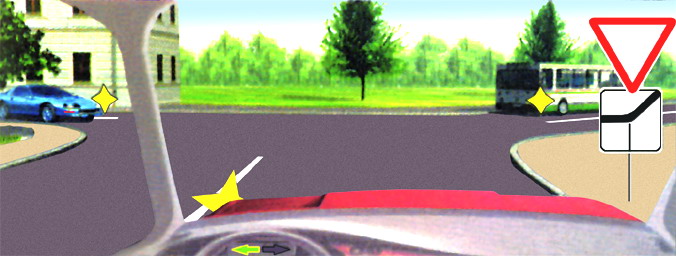 Перекресток неравнозначный. Преимущество имеют транспортные средства, находящиеся на главной дороге. Вы находитесь на второстепенной дороге и уступаете обоим транспортным средствам, независимо от направления их дальнейшего движения.